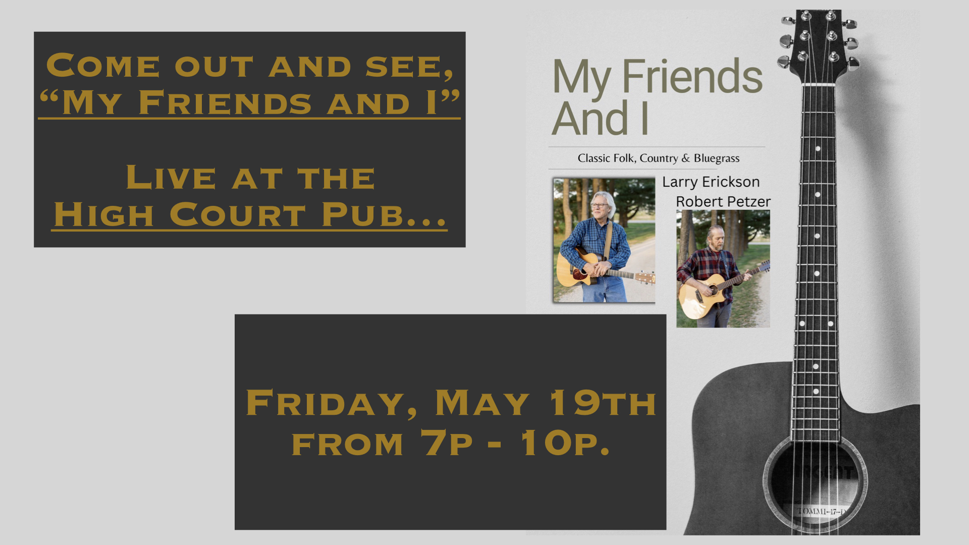 EventsIt seems we can’t find what you’re looking for. Perhaps searching can help. Loading view. Events Search and Views Navigation Search Enter Keyword. Search for Events by Keyword. Find Events Event Views Navigation List List Month Day Today 2023-05-13 May 13, 2023 - 2023-06-16 June 16, 2023 Select date. May 2023 Sat 13 May 13, 2023 @ 7:00 pm - 10:00 pm Jason Helder live at the PUB! Fri 19 May 19, 2023 @ 7:00 pm - 10:00 pm My Friends and I Live at the High Court Pub Sat 20 May 20, 2023 @ 7:00 pm - 10:00 pm Lou Shields Live at the High Court Pub Fri 26 May 26, 2023 @ 7:00 pm - 10:00 pm John Rislove Live at the High Court Pub Sat 27 May 27, 2023 @ 7:00 pm - 10:00 pm Lost Faculties w/Ringer Starr Live at the High Court Pub June 2023 Fri 2 June 2, 2023 @ 7:00 pm - 10:00 pm Nick Foytick live at the High Court Pub Sat 3 June 3, 2023 @ 7:00 pm - 10:00 pm Tim Fast live at the High Court Pub Fri 9 June 9, 2023 @ 7:00 pm - 10:00 pm Clay Fulton live at the High Court Pub Sat 10 June 10, 2023 @ 8:00 pm - 11:00 pm Rustic Moon at High Court Pub Fri 16 June 16, 2023 @ 7:00 pm - 10:00 pm Ryan Howe live at the High Court Pub Previous Events Today Next Events Subscribe to calendar Google Calendar iCalendar Outlook 365 Outlook Live Export .ics file Export Outlook .ics file